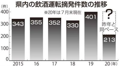 2020/08/30県内一般ニュース新型コロナウイルス感染拡大で外での飲酒を控える人も多いとみられる中、県内の飲酒運転の摘発は減少せず高止まりしている。今年7月末時点の摘発件数は前年同期比2件増の213件。過去5年で最多だった昨年(年間401件)に並ぶペースだ。中には自宅や...