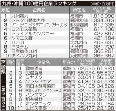 2020/08/19経済一般東京商工リサーチは、2019年度売上高(単体)が100億円を超えた九州・沖縄の企業ランキングを発表した。本県は前年度と同じ29社。売上総額は133億円(1・9%)増の7005億円で、11年ぶりに7千億円を突破した。全体では5社減の689社...