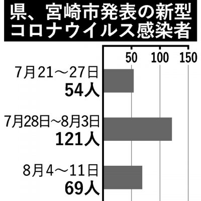2020/08/12県内一般ニュース4~11日に県と宮崎市が発表した新型コロナウイルスの感染者数は69人で、県内全体の感染者数は前週(7月28日~8月3日)から52人減った。ただ都城市は30~90代男女20人の感染が確認され、前週から15人増となり、県内市町村で最多になった...