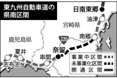 2020/07/30県内一般ニュース国土交通省は29日、東九州自動車道県南区間の新たなインターチェンジ(IC)となる日南東郷ICと、奈留IC(仮称)について、上下線どちらの方面にも乗り降りできるフルIC化に向けた都市計画変更手続きに着手したと発表した。両ICは一方面のみ乗り...
