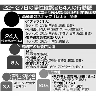 2020/07/28県内一般ニュース県内で22~27日に新型コロナウイルス感染が確認されたのは54人に上った。このうち、クラスターが発生した高鍋町のスナック「Little(リトル)」関連は24人。宮崎市の理髪店では来店客ら8人の感染が確認され、同店を経営する男性もスナックを...