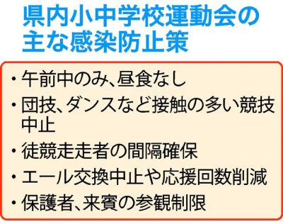 2020/07/22県内一般ニュース県内の市町村教委や小中学校が秋の運動会開催に向け、新型コロナウイルスの感染リスクにどう対応するか頭をひねっている。「団技、ダンスは取りやめる」「エール交換や応援はなし」。身体的接触や飛沫(ひまつ)感染の防止などへあの手この手を模索し、多く...