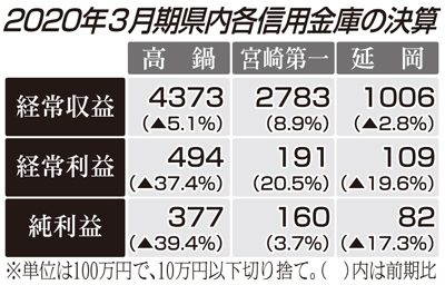 2020/06/30経済一般高鍋と宮崎第一の両信用金庫は29日、総代会をそれぞれ開き、2020年3月期決算を報告した。高鍋信金は貸出金利息、国債等債券売却益などの減少により3期連続の減収減益。宮崎都城信用金庫と南郷信用金庫が合併して今年1月に誕生した宮崎第一信金は、...