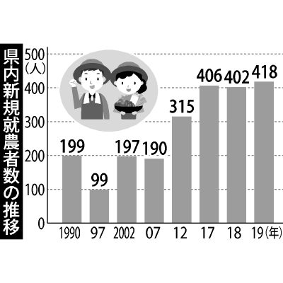 2020/06/29県内一般ニュース県内で2019年に新たに就農したのは418人(前年比16人増)で、平成以降最多だったことが、県のまとめで分かった。農業法人への就職数が高水準を維持したほか、後継者の就農が増え、全体を押し上げた。UIJターン者も確保し、県は「農家の自助努力...