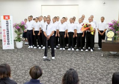 2025/08/01県内一般ニュース第107回全国高校野球選手権大会(5日開幕、阪神甲子園球場)に2年連続で出場する宮崎商業高野球部の出発式は31日、宮崎市の宮崎ブーゲンビリア空港であった。橋口光朗監督やベンチ入りメンバーら約30人が関係者から激励を受け、空路で大阪入りした...