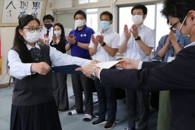 2020/05/23県内一般ニュース県高校体育連盟(県高体連)と県高校文化連盟(県高文連)の本年度統一スローガンを考案した宮崎市・宮崎南高3年の藤井茉理(まつり)さん(18)に22日、賞状と記念品が贈られた。今月末に開幕予定だった第47回県高校総合体育大会(県総体)で披露さ...