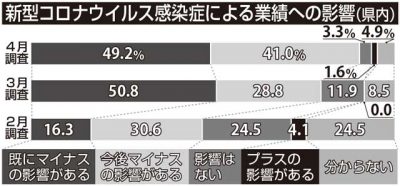 2020/05/19経済一般帝国データバンク宮崎支店が18日までに発表した新型コロナウイルス感染症に対する企業の意識調査結果によると、業績に「マイナスの影響がある」と答えた県内企業は9割を超えた。調査は4月16~30日に実施され、2、3月の調査に続き3回目。悪影響を...