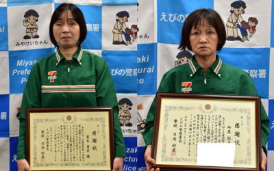 2020/05/03地域の話題うそ電話詐欺(架空請求詐欺)を未然に防いだとして、えびの市大明司のセブンイレブン大明司店店長の黒木重美さん(49)=写真左=と、店員の外屋祐美子さん=同右=(64)に、えびの署長から感謝状が贈られた。 同署や同店によると、3月30...