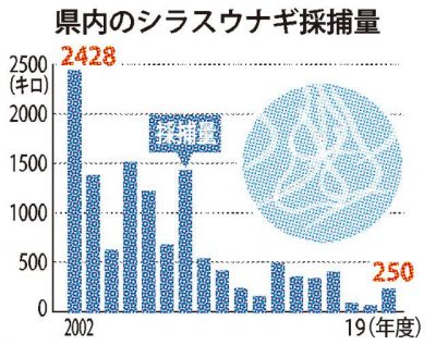 2020/05/03県内一般ニュースニホンウナギの稚魚「シラスウナギ」の2019年度漁期の県内採捕量は250キロで、3年ぶりに200キロ台を回復した。記録的な不漁だった18年度の73キロの3倍以上。養鰻関係者は胸をなで下ろすが、新型コロナウイルス感染拡大によるウナギの消費落...