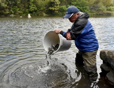 日南で稚アユ放流 6月漁解禁を前に約2万2千匹