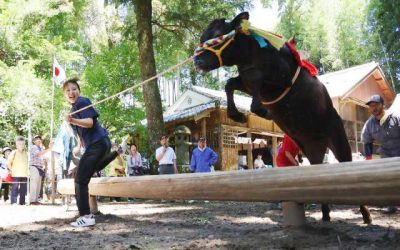 2025/07/29県内一般ニュース家畜の無病息災や五穀豊穣を願う牛越祭は28日、えびの市西川北の菅原神社(下東嘉成宮司)であった。400年以上続く県の無形民俗文化財。農家らに引かれた牛が豪快に丸太を跳び越え、見物客を沸かせた。 飾り付けられた生後1カ月~7歳の黒牛...