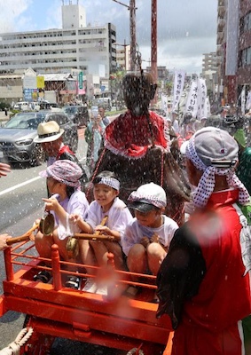 2025/07/29県内一般ニュース子どもの水難よけや健やかな成長を願う「水かけ地蔵尊まつり」(中村町地蔵尊奉賛会主催)の山車(だし)巡行は28日、宮崎市中村西1丁目の善栖寺周辺であった。地区の児童や園児ら約150人が参加。強い日差しが照り付ける中、地域住民から水をかけられ...