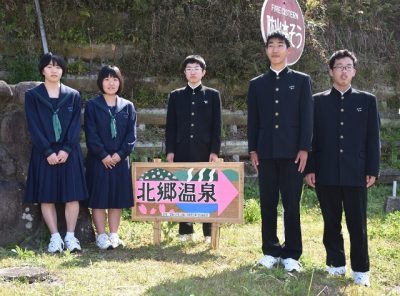2020/03/28地域の話題日南市北郷町の北郷小中(田上幸雅校長)を今春卒業した中学生たちが地域活性化のために制作した「北郷温泉」への道案内の看板が町内に設置され、25日、除幕式が催された。 卒業生34人は本年度、総合的な学習の時間で「北郷応援団」を結成。6...