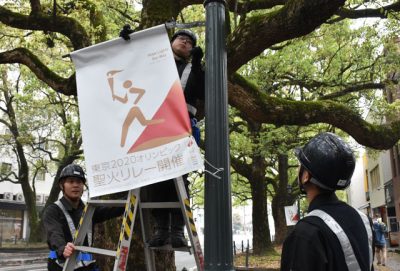 2020/03/27県内一般ニュース新型コロナウイルス感染症拡大により東京五輪が延期されたことを受け、聖火リレー県実行委は26日、宮崎市の県庁前楠並木通りの街灯や橘通りアーケードなどに設置していたペナント100枚を撤去した=写真。約1カ月前に設置したばかりで、関係者は「機運...