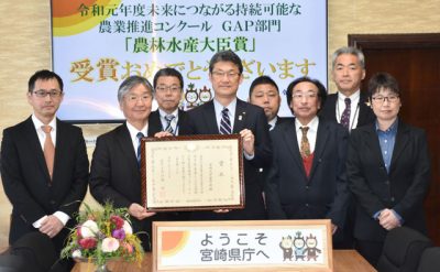 2020/03/17県内一般ニュース宮崎大農学部は農林水産省の「未来につながる持続可能な農業推進コンクール」GAP部門で、県内初となる農林水産大臣賞を受賞した。本県のGAP推進や人材育成に貢献していることが評価された。池ノ上克学長ら5人が16日、県庁を訪れ河野知事に受賞を報...