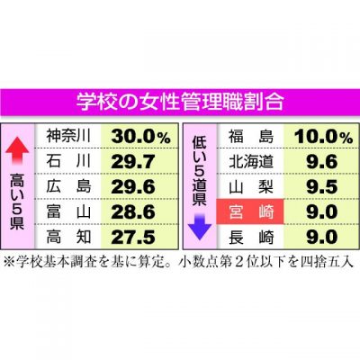 2020/03/08県内一般ニュース県内の小中学校や高校などでの管理職に占める女性の割合が、都道府県別で長崎県と並んで最も低い9・0%だったことが7日、文部科学省の2019年度学校基本調査で分かった。県内の女性管理職は近年横ばいで推移しており、県教委は「家庭や職場での負担が...