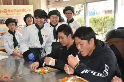 2020/02/05スポーツnow宮崎市清武町で春季キャンプを張るオリックス・バファローズの新人選手13人は5日、宮崎市・日章学園高(得能剛校長、1277人)を訪問。パティシエ科1年生26人とパンケーキ作りに挑戦した。 同校3年の平野大和選手が、育成4位で入団した...