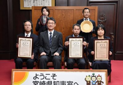 2020/02/03トピックnews県は3日、県の伝統的工芸品「日向剣道防具」を制作する新名博文さん(58)=宮崎市吉村町=と、「宮崎ロクロ工芸品」を手掛ける田村和也さん(63)=同市村角町=を伝統工芸士に認定した。県庁で河野知事から認定証が交付された。 西都市の「...