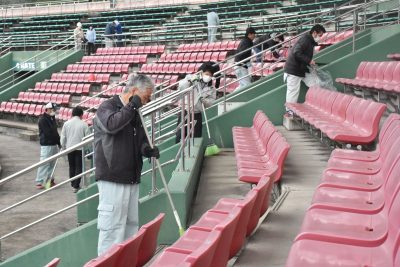 春季キャンプ前に球場清掃 建設、電気工事業者らボランティア