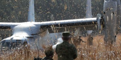 オスプレイ飛来、威圧感 日米共同訓練ルポ