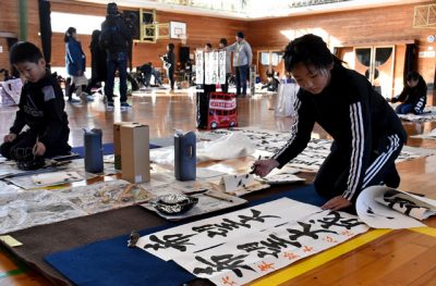 2020/01/05きょうの出来事延岡書道協会(植野聖鳳会長)の「第59回席上揮毫大会」は5日、延岡市の東小体育館であった。同市などで書道を学ぶ5歳から高校生までの62人が新春の書き初めに挑んだ。 参加者は手本を見ながら集中して筆運び。小学生は「思いやり」「春の山...