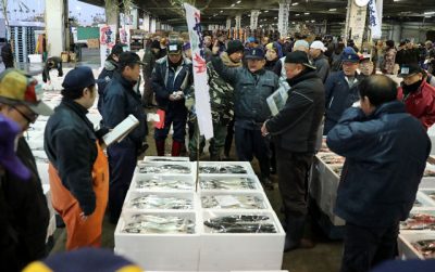 新鮮農水産物、次々に落札 宮崎市中央卸売市場で初競り