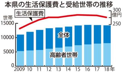 2019/12/29県内一般ニュース2018年度に県内で生活保護を受給した高齢者世帯は8015世帯で、全体に占める比率は56.2%となり過去最高だったことが28日、県の調査で分かった。過去10年で高齢者世帯の受給世帯数は1.5倍に増え、傷病、障害、母子世帯などを加えた全体の...