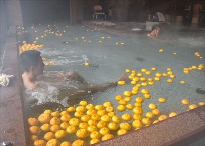 2019/12/22県内一般ニュース冬至(22日)を前に、西米良村村所の温泉施設「ゆた~と」で21日、ゆず湯が始まった。香りの強さで有名な同村産ユズの甘酸っぱい香気が浴室に漂い、観光客らの心身を癒やしている。 冬至にゆず湯に入ると風邪をひかないとの言い伝えにちなみ毎...