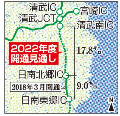 2019/12/21県内一般ニュース国土交通省宮崎河川国道事務所は20日、東九州自動車道清武南―日南北郷インターチェンジ(IC、17・8キロ)が2022年度に開通する見通しが立ったと発表した。開通すれば宮崎、日南市が初めて東九州道でつながる。両市役所間の所要時間は主に国道2...