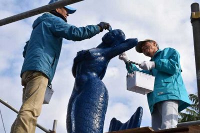 2019/12/14地域の話題日南市のJR大堂津駅前にある人魚像「海の乙女像」が、住民の手で“お色直し”された。像本体を濃い青、台座はベージュに塗り直し、像があるロータリーの木も植え替えた。今春新築された駅舎とともに、大堂津の玄関口が見違えた。 像はコンクリー...