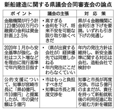 2019/12/10県内一般ニュース宮崎―神戸航路を運航する宮崎カーフェリー(宮崎市)に対する県の40億円貸し付け計画を巡り、9日まで計4日間開いた県議会合同審査会は「金融機関の融資金利」「新船の安全基準」「宮崎市の支援の在り方」を焦点に議論が紛糾した。議員は航路の必要性は...