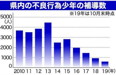2019/12/07社会news県内で深夜徘徊はいかいや喫煙など不良行為で補導される20歳未満の少年が減少し、初めて1千人を切った2018年の931人から今年は594人(10月末現在)と過去最少ペースとなっている。県警は「スマートフォンの普及で屋内で遊ぶことが多くなり、...