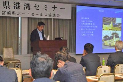 2019/10/29経済一般本県の細島、宮崎、油津港を首都圏でPRする県港湾セミナー(県ポートセールス協議会主催)が28日、東京都千代田区の東海大学校友会館であった。首都圏を中心に製造や物流、港湾関係企業・団体などの約220人を招待。3港の定期航路や施設などを紹介し...