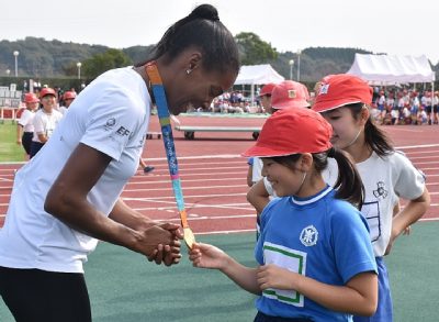 元五輪「金」の陸上選手と宮崎市の小学生が交流