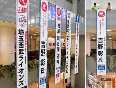2019/10/10トピックnews延岡市が発祥の地である旭化成の名誉フェローで、名城大教授の吉野彰さん(71)がノーベル化学賞に決まったことを受け、宮崎市の宮崎ブーゲンビリア空港に10日、偉業を祝福する懸垂幕が掲げられた。 長さ6メートルで、1階オアシス広場の吹き...