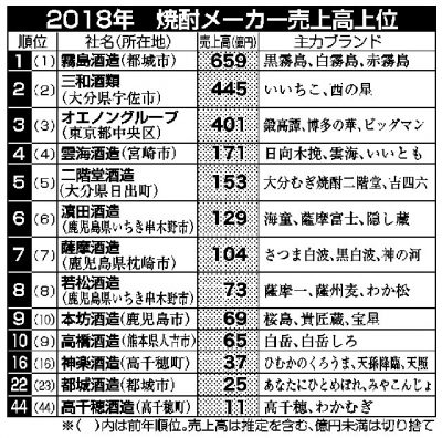2019/08/22経済一般帝国データバンク福岡支店が21日発表した全国の焼酎メーカーの2018年売上高ランキングで、霧島酒造(都城市)が7年連続の首位となった。同社の売上高は、同支店の集計(1~12月期)で659億円(前年比3・4%減)と、昨年に続き2位以下を大き...