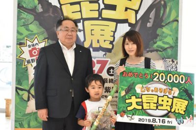 2019/08/16トピックnews宮崎市の宮交シティ紫陽花(あじさい)ホールで開かれている特別展「ムシとあそぼう!大昆虫展」(宮崎日日新聞社など主催)の来場者が16日、2万人を突破した。 2万人目になったのは新富町上富田の主婦、手島麻衣さん(35)、長男悠喜(はる...