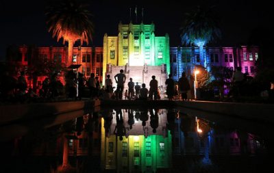 LGBT象徴「レインボー」に 県庁ライトアップ