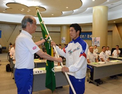 2019/08/02一般スポーツ茨城県で開かれる第74回国民体育大会(9月28~10月8日)の出場権を懸けた第39回九州ブロック秋季大会の県選手団への団旗授与式は1日、宮崎市の県電ホールであった。 団旗は、団長の春山豪志・県体育協会会長から総監督の佐多裕之県体協...