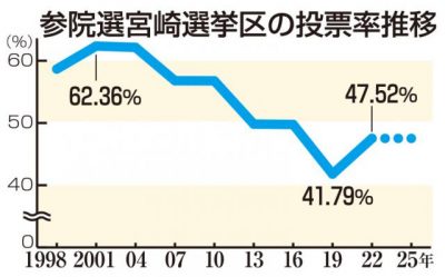 2025/07/19県内一般ニュース20日投開票の参院選宮崎選挙区(改選数1)では、投票率にも注目が集まる。2013年以降4回連続で50%を割り込む低投票率が続いてきたが、一部陣営や識者からは「50%を超えるのでは」と上昇を期待する声も。今回が事実上の「政権選択選挙」の意味...