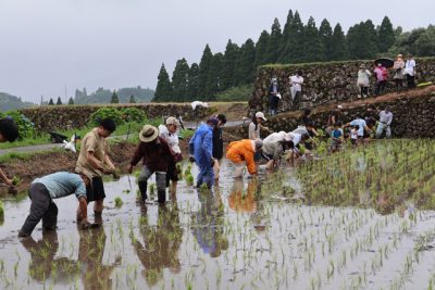 坂元棚田でオーナーが田植え 市内外10組24人など約50人参加