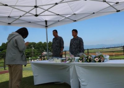 2025/06/20県内一般ニュース愛知県犬山市の農業用ため池に航空自衛隊新田原基地(新富町)所属のT4練習機が墜落し、パイロット2人が死亡した事故を受け、同基地は19日、基地東側の新田原展望広場に献花台を設置した。2人の突然の死を悼み、多くの人が献花に訪れた。 献...