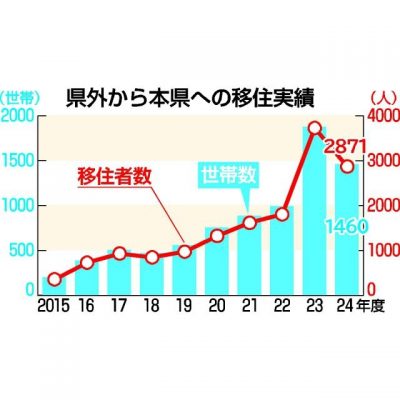 2025/06/19県内一般ニュース県は18日、2024年度の県内への移住者が1460世帯2871人だったと明らかにした。統計を取り始めた15年度以降で、世帯数、人数ともに過去2番目の多さだった。一方で、過去最多だった前年度実績を2割以上下回り、右肩上がりの増加傾向から減少...