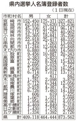 2025/06/07県内一般ニュース県選管は6日、選挙人名簿登録者数(1日現在)を発表した。県内の有権者数は87万3562人(男性40万9118人、女性46万4444人)で、前回(3月1日時点)から1301人減少した。 増加したのは都城市25人、三股町2人。西米良村...