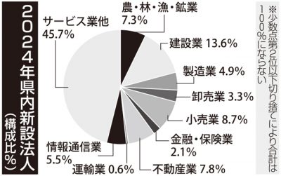 2025/06/19経済一般県内で2024年に設立された法人は前年比4.1%減の828社だったことが東京商工リサーチの調査で分かった。産業別では10分野のうち7分野で減少したものの、全体では5年連続の800社超えとなり高水準を維持。経営形態では前年に続き合同会社が3...