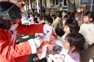 川南に「バイクサンタ」登場 園児らにプレゼント