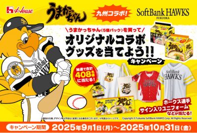 2025/09/01サンプルハウス食品グループ本社株式会社九州でお馴染み”うまかっちゃん“と“ソフトバンクホークス“が初コラボ!2025年9月1日(月)より開始 ハウス食品株式会社は、1979年から発売しているとんこつ味の袋麺「うまかっちゃん」と1988年から福岡県...