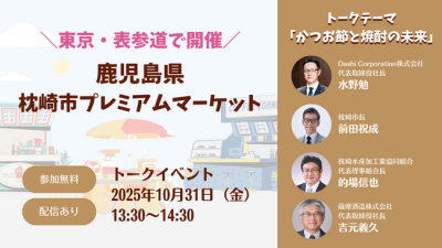 表参道に鹿児島県枕崎市の特産品が集合!プレミアムマーケットのトークイベントで「かつお節と焼酎の未来」をテーマにDashi Corporation代表 水野勉が講演~ 10月31日(金)13:30より~