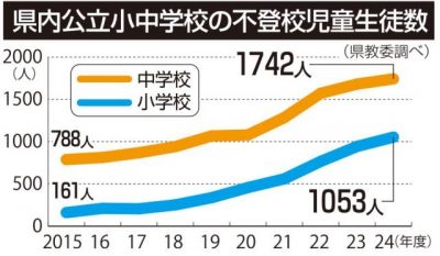 2025/10/30県内一般ニュース県教委が県内の公立学校を対象に実施した2024年度調査で、30日以上欠席した不登校の児童生徒が小学校1053人(前年度比110人増)、中学校1742人(62人増)に上り、ともに過去最多となったことが29日分かった。県教委人権同和教育・生徒...