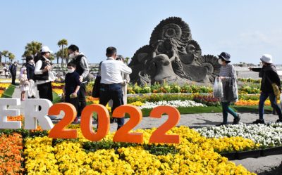宮崎市でサンドフラワーフェスタ 来場者、砂の造形と満開の花々楽しむ